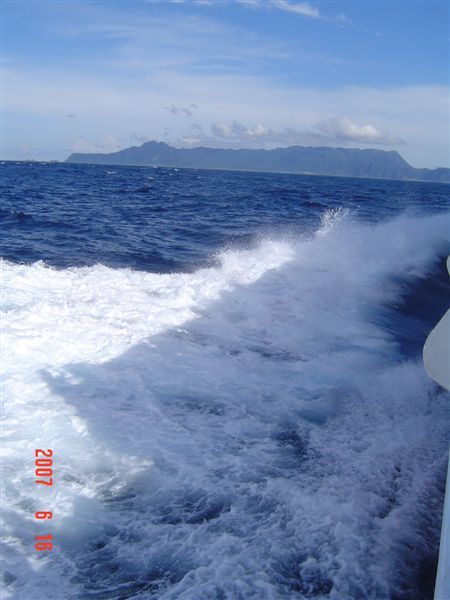 直到快到蘭嶼陸地時, 才勉強爬上甲板看看海天一線的美景。